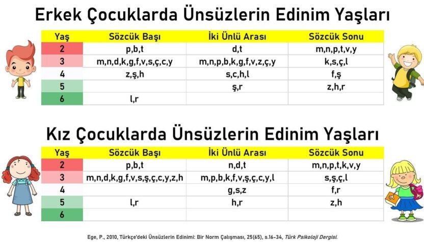 Dil ve konuşma becerileri gelişirken çocuklar, kendi dil sistemlerinde hangi seslerin bulunduğunu ve bu seslerin bir araya geliş kurallarını öğrenir. Her konuşma sesinin (harflerin) belirli bir yaş aralığında edinilmesi beklenir. Bu yaş aralığının sonunda ses, konuşma içinde doğru şekilde üretilebiliyorsa edinilmiş sayılır.